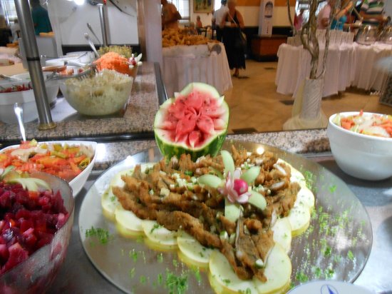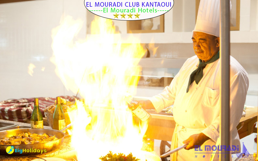 L hotel El Mouradi Club Kantaoui propose 3 restaurants et 5 bars : Le restaurant buffet L espadon le restaurant pizzeria Langoustine le restaurant plage, le lobby bar Saumon le bar Dauphin ,le bar piscine, le bar plage et le Cocktail beach bar
